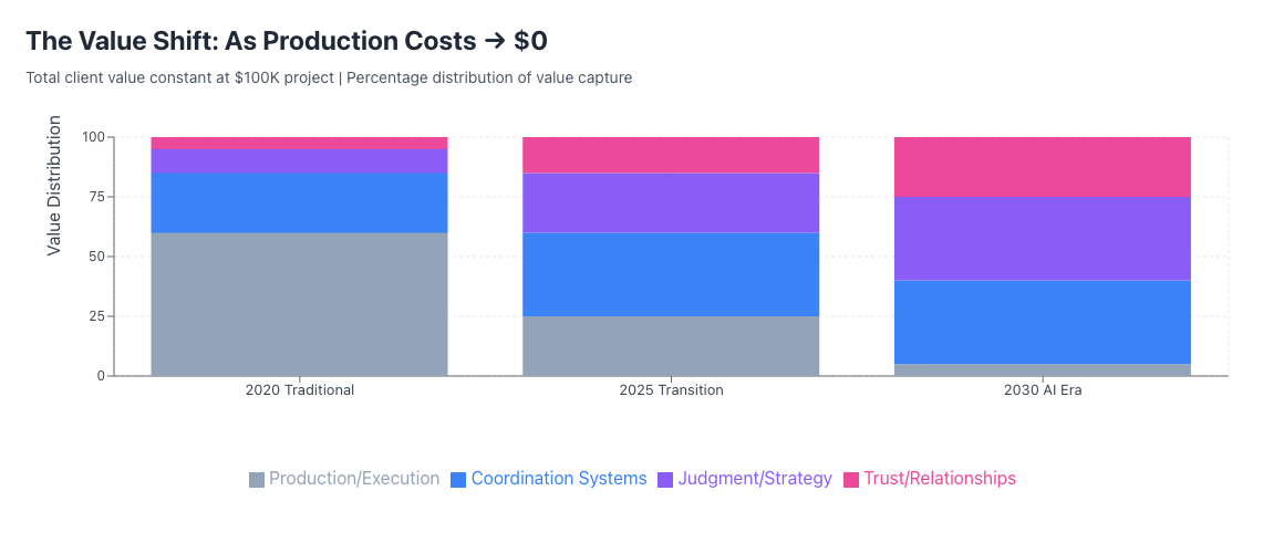 New AI tools push marketing production costs toward $0. As a result, the value for marketing teams—or really most knowledge workers—shifts from production toward coordination, judgment or strategy, and trust or relationships. Even further still, I’d argue it’s always been and will ever be about telling stories. Here’s a visualization I was working on with Claude.