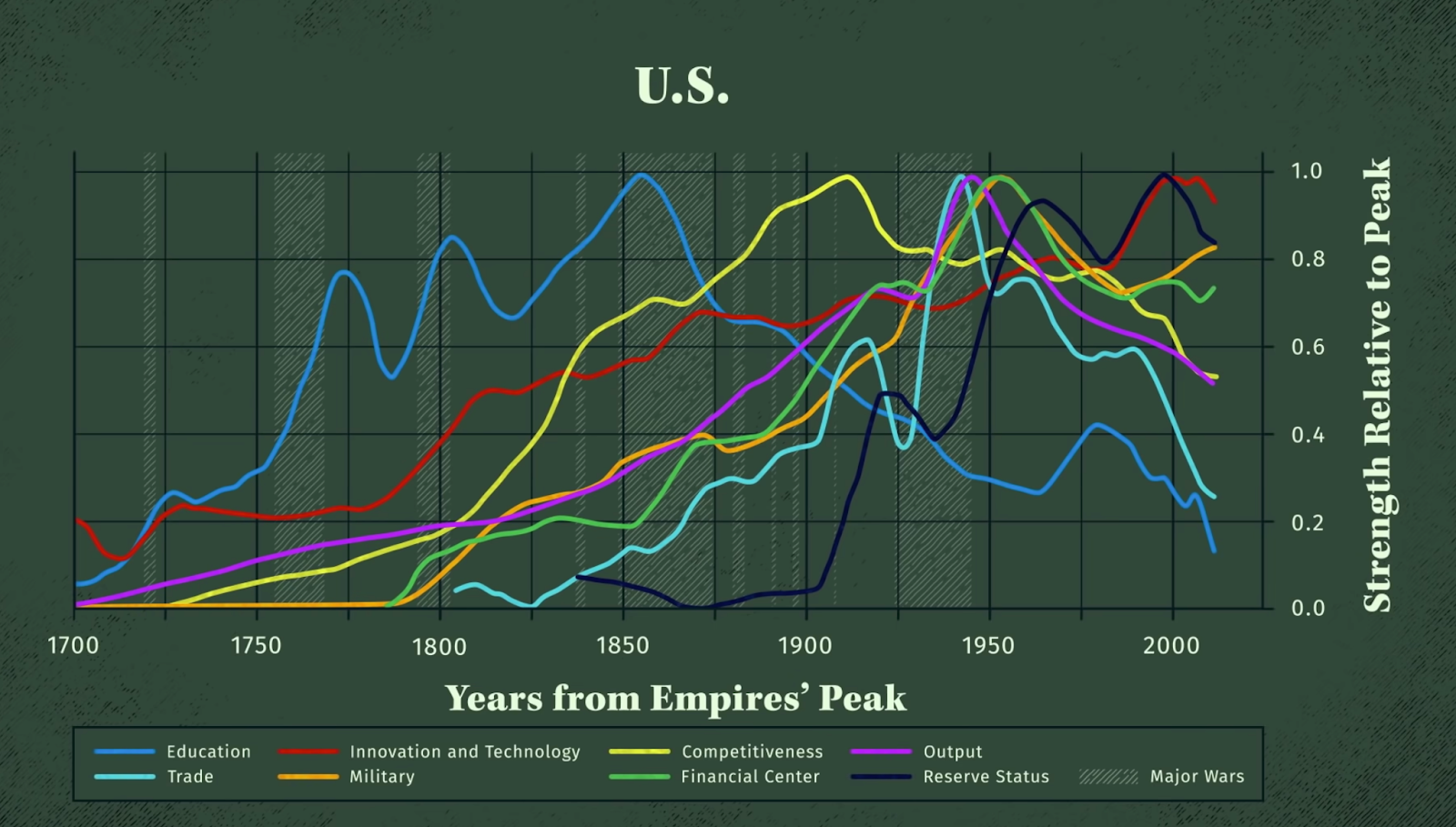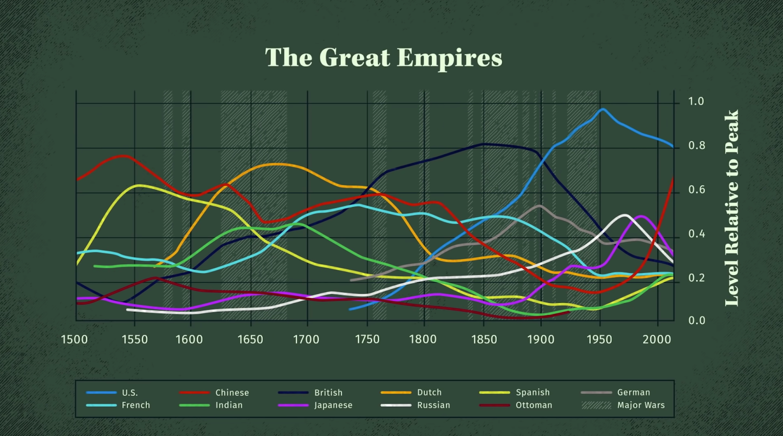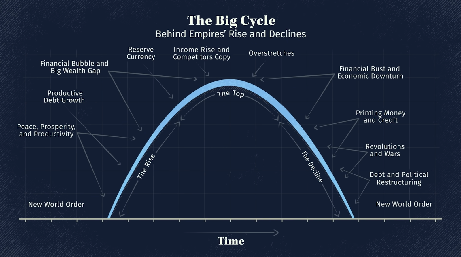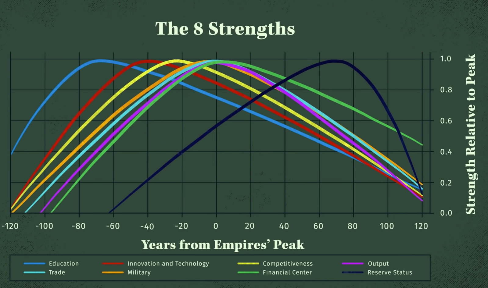 It’s important to note that these strengths decline in a similar order. The rise and decline of these strengths create what Dalio calls “The Big Cycle.”