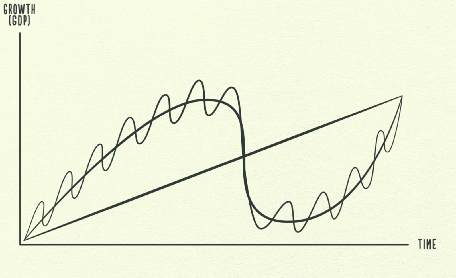 In this graphic, Dalio depicts a simplified version of the short-term debt cycle (the squiggly line), the long-term debt cycle (the sloped curve), and productivity growth (the straight line).