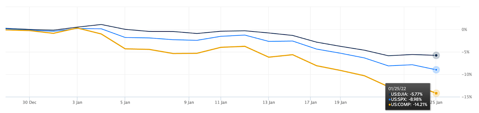This rate increase is partly why the stock market has taken a nosedive lately. Investors think interest rates will rise, which lowers the value of debt-ridden and high-growth companies, like tech stocks. The Nasdaq, composed of many big tech companies, is down more than 14 percent, just over the last month.